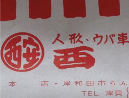 [ 乳母車 ] 大阪府和泉市 「人形」の「形」、ツクリが「久」になっています。 「西安」、ロゴマークは「西」ですがロゴタイプは横棒が1本多く「no.13」と似ています。ウバ車は今のベビーカーですね。 オモチャ屋さんの包装紙でした。